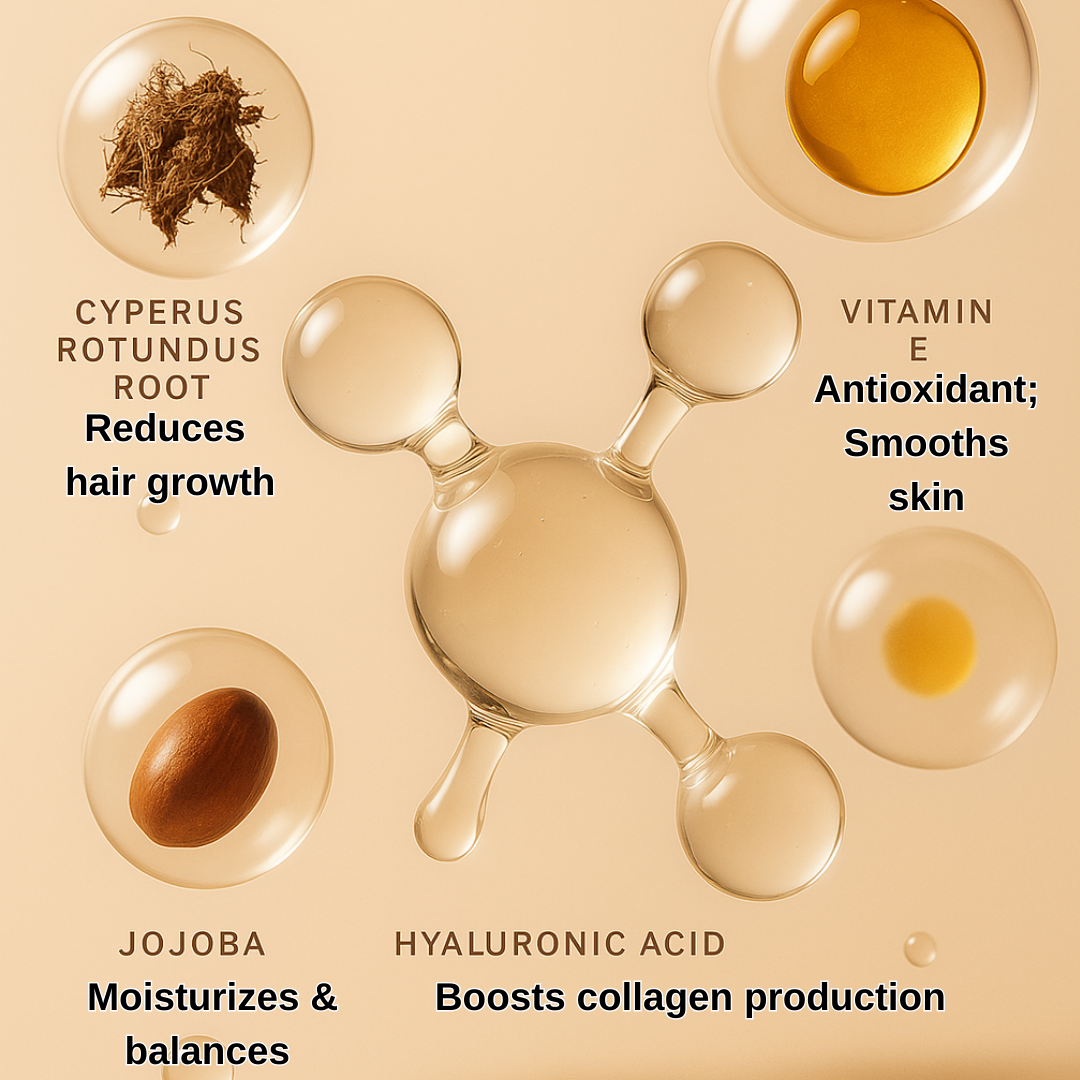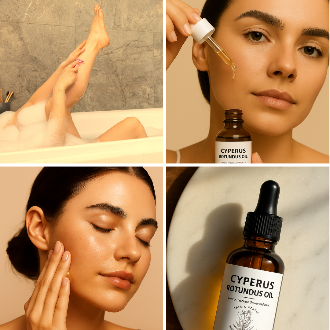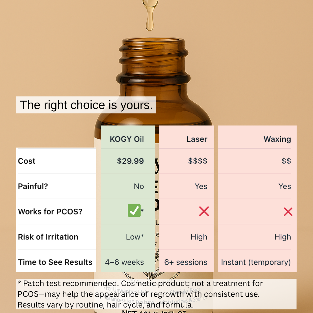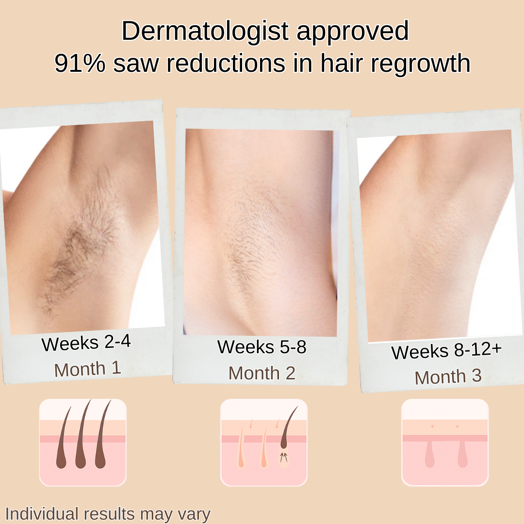 I have PCOS and have had unwanted facial hair since I was a teen. I spent over 5K on laser hair removal over 15 year's ago only for it to not work but also, it scarred my face in certain area's. I have to shave EVERYDAY. And was starting to have to shave twice a day. It was getting more and more difficult to cover with makeup, even with high end, because the texture from my facial hair growing back after just a few hour's. I use this wherever I don't want hair. It doesn't dry out my skin, feels like a spa treatment, smells amazing and SLOWS THE HAIR ENOUGH FOR ME TO NOT SHAVE MY ARMS EVERYDAY, THE SHAVE ON MY LEGS LASTS LONGER, AND MY FACE IS SO SMOOTH FOR AT LEAST 12 HOURS AFTER SHAVING AND APPLYING MAKEUP. People have told me my makeup looks great and my skin so smooth.My tips for application, after you shave your BODY part(s) apply this oil and WASH YOUR HANDS VERY WELL AFTER B4 TOUCHING THE HAIR ON YOUR HEAD OR LASHES/BROWS.AFTER you remove the hair from your face, whichever method you choose. First use a toner and let that dry, then use this oil and EITHER use 1 hour before applying makeup so it has time to work and dry down, or use at night every other night alternating with your regular skincare routine. Use a bonnet or wrap for your hair so the oil doesn't get on the hair on your head and change / wash your pillow case often so the oil that gets on there DOESN'T end up somewhere you don't want it to. I still have facial hair,unfortunately, but this helps my shaves EVERYWHERE last longer!1st photo is of one side shaved and oil applied and the other shaved but no oil applied. Time elapsed is 12 hours. After a full 24 hours my facial hair does grown back but definitely SLOWER and maybe even a little thinner. My shaving is A LOT FASTER NOW.2ND PHOTO IS shaved, oil applied, AND MAKEUP on but you can see smooth application and very little texture, some will remain but it is SO MUCH BETTER NOWIf it leads to LESS hair or STOPS it, I'll come back and update.
